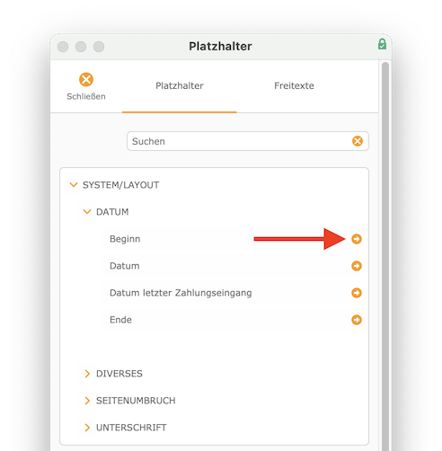 Positionieren Sie den Cursor in der Textvorlage an der Stelle, an welcher der Platzhalter einzusetzen ist. Klicken Sie anschließend auf den gewünschten Platzhalter in der Auswahlliste.